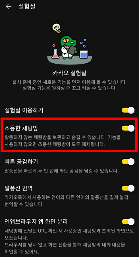 카카오톡 실험실에는 '조용한 채팅방, 빠른 공감하기, 말풍선 번역, 인앱브라우저 앱 화면 분리, 키워드 알림 모아보기' 기능들이 있어 자신이 원하는 기능들을 활성화 해 보실 수 있습니다.