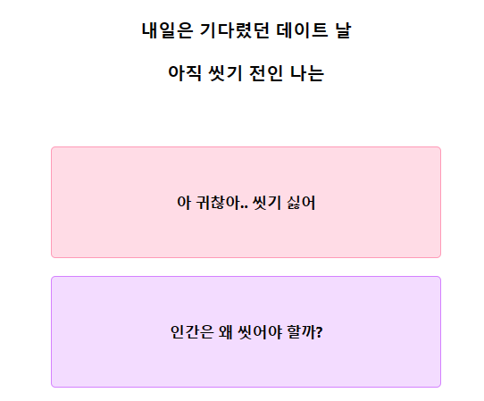 1. 내일은 기다렸던 데이트 날 아직 씻기 전인 나는? 1) 아 귀찮아.. 씻기 싫어 2) 인간은 왜 씻어야 할까?