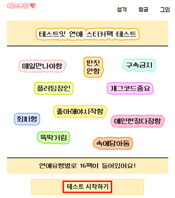 위의 링크를 참고하셔서 '테스트잇 연애 스티커팩 테스트' 사이트에 들어가셔서 '테스트 시작하기' 버튼을 클릭하시면 테스트를 시작할 수 있습니다.