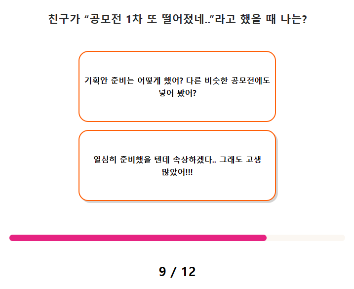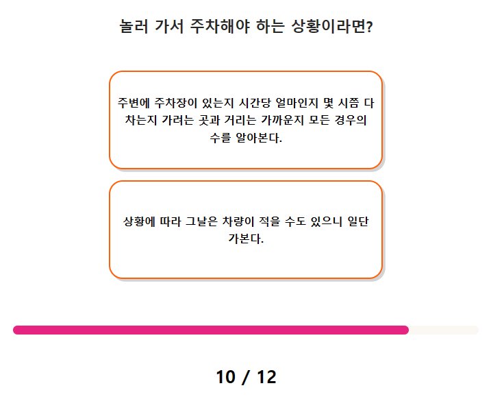 9. 친구가 "공모전 1차 또 떨어졌네.."라고 했을 때 나는? 10. 놀러 가서 주차해야 하는 상황이라면?