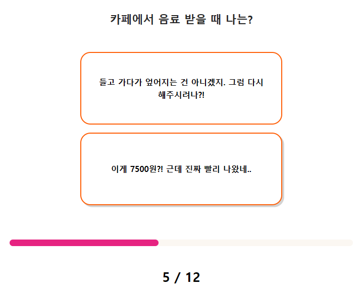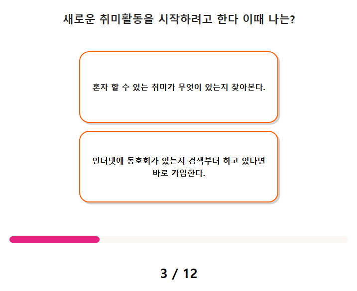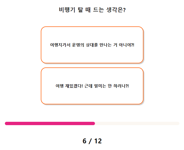해변 성격 테스트 질문(문항) 수는 총 12가지이며, 테스트 소요 시간은 약 2분에서 3분 정도 걸립니다.