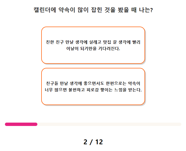 2. 캘린더에 약속이 많이 잡힌 것을 봤을 때 나는? 1) 친한 친구 만날 생각에 설레고 맛집 갈 생각에 빨리 이날이 되기만을 기다려진다. 2)친구들 만날 생각에 좋으면서도 한편으로는 약속이 너무 많으면 불편하고 피로감이 쌓이는 느끼을 받는다.