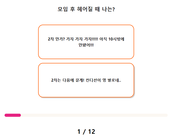 1. 모임 후 헤어질 때 나는? 1) 2차 안가? 가자 가자 가자!!! 아직 10시 밖에 안됐어!! 2) 2차는 다음에 갈게! 컨디션이 영 별로네..