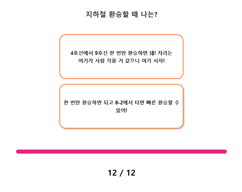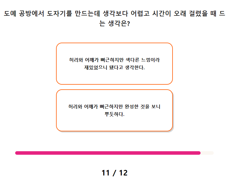 11. 도예 공방에서 도자기를 만드는데 생각보다 어렵고 시간이 오래 걸렸을 때 드는 생각은? 12. 지하철 환승할 때 나는?