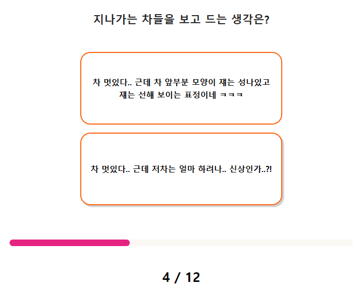 3. 새로운 취미 활동을 시작하려고 한다. 이때 나는? 4. 지나가는 차들을 보고 드는 생각은?