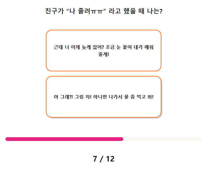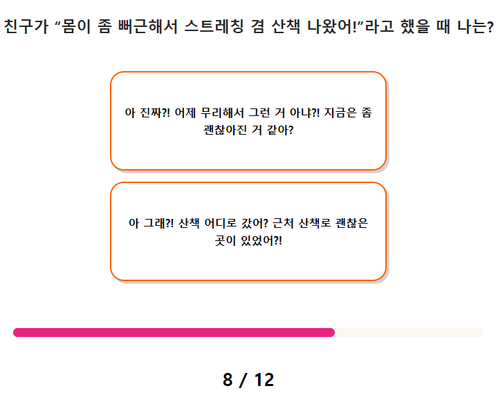 7. 친구가 "나 졸려 ㅠ ㅠ"라고 했을 때 나는? 8. 친구가 "몸이 좀 뻐근해서 스트레칭 겸 산책 나왔어!"라고 했을 때 나는?