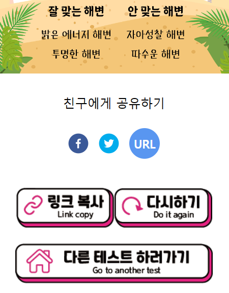 이렇게 나의 성격으로 해변을 알아볼 수 있었는데요. 다들 자신의 성격 키워드와 비슷한 점들이 많이 나오셨나요? 테스트 결과를 확인한 창에서 스크롤을 아래로 내리시면 '친구에게 공유하기' '링크 복사' '다시하기' '다른 테스트 하러가기' 버튼이 있어 케이 테스트 홈페이지에서 다른 테스트를 구경해보실 수 있습니다.
