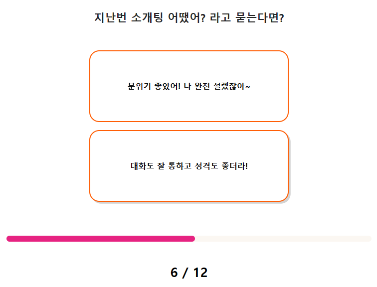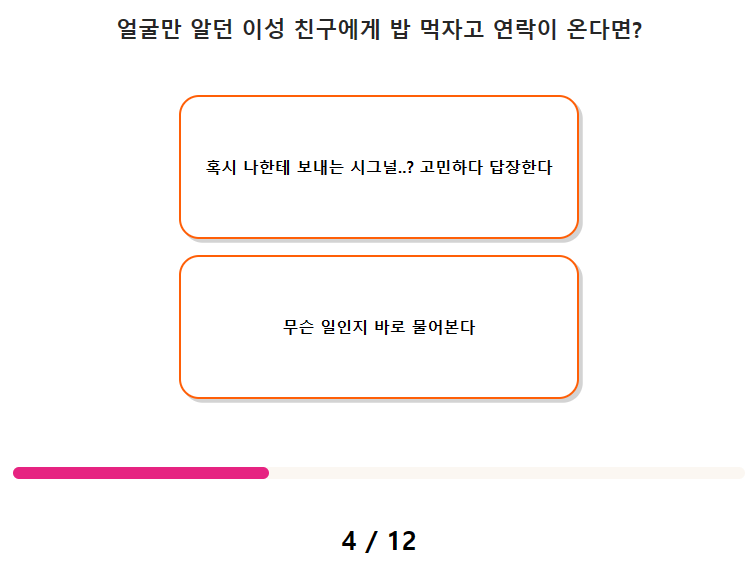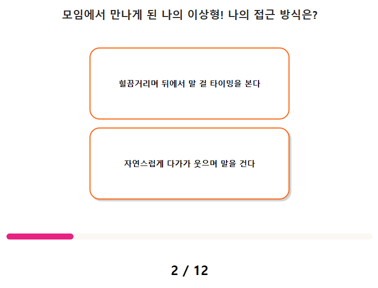 2. 모임에서 만나게 된 나의 이상형! 나의 접근 방식은? 1) 힐끔거리며 뒤에서 말 걸 타이밍을 본다. 2) 자연스럽게 다가가 웃으며, 말을 건다.