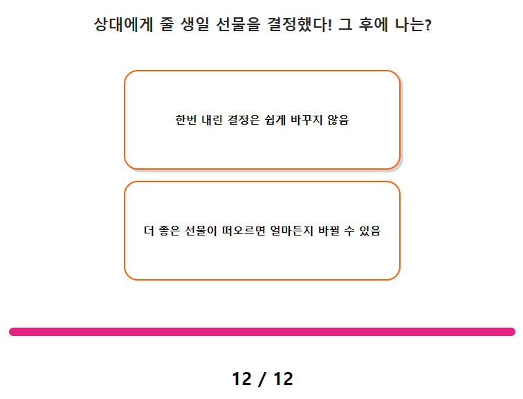 11. 데이트 중 먹고 싶은 거 있어? 라는 물음에 나는? 12. 상대에게 줄 생일 선물을 결정했다! 그 후에 나는?