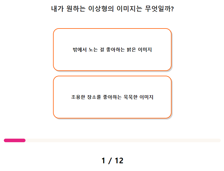 1. 내가 원하는 이상형의 이미지는 무엇일까? 1) 밖에서 노는 걸 좋아하는 밝은 이미지 2) 조용한 장소를 좋아하는 묵묵한 이미지