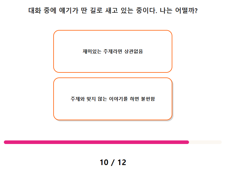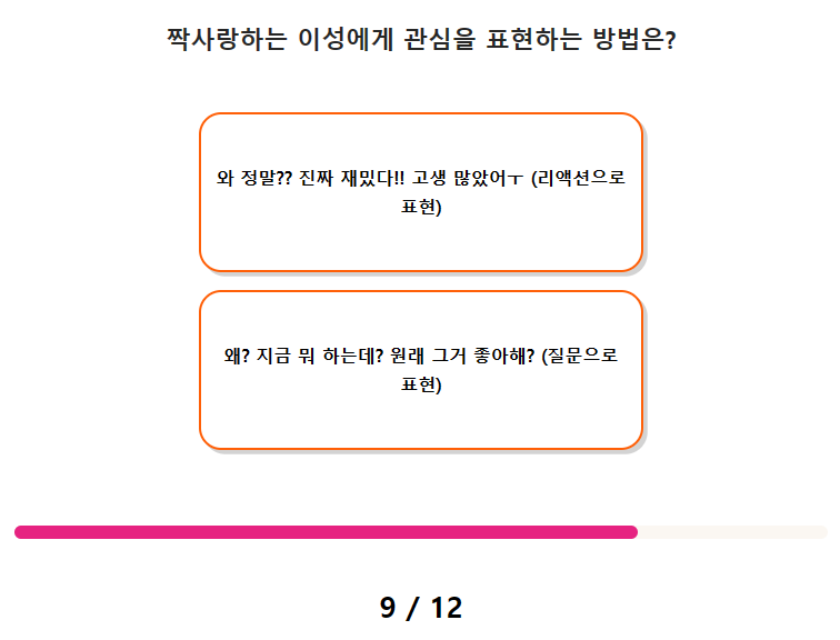 9. 짝사랑하는 이성에게 관심을 표현하는 방법은? 10. 대화 중에 얘기가 딴 길로 새고 있는 중이다. 나는 어떨까?