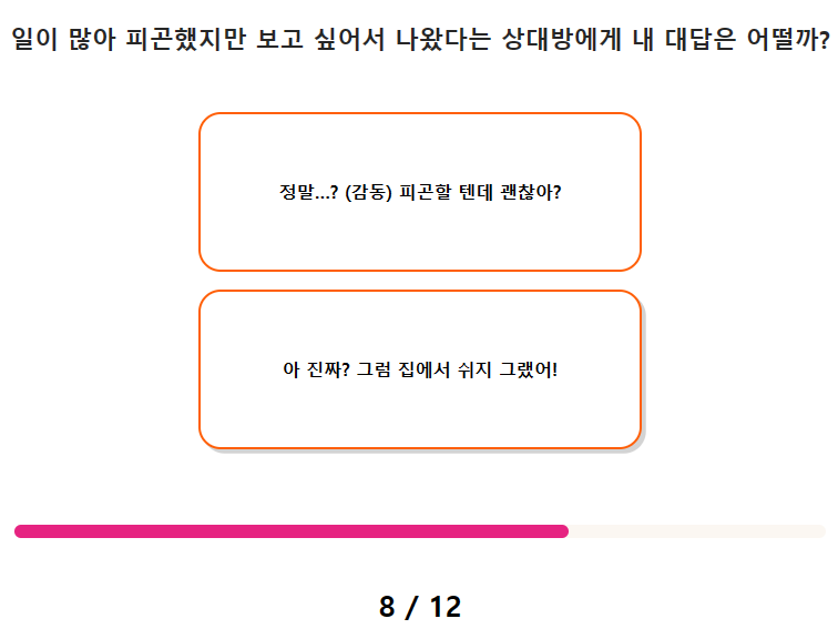 7. 갑자기 연애가 하고 싶다는 친구에게 나는? 8. 일이 많아 피곤했지만 보고 싶어서 나왔다는 상대방에게 내 대답은 어떨까?