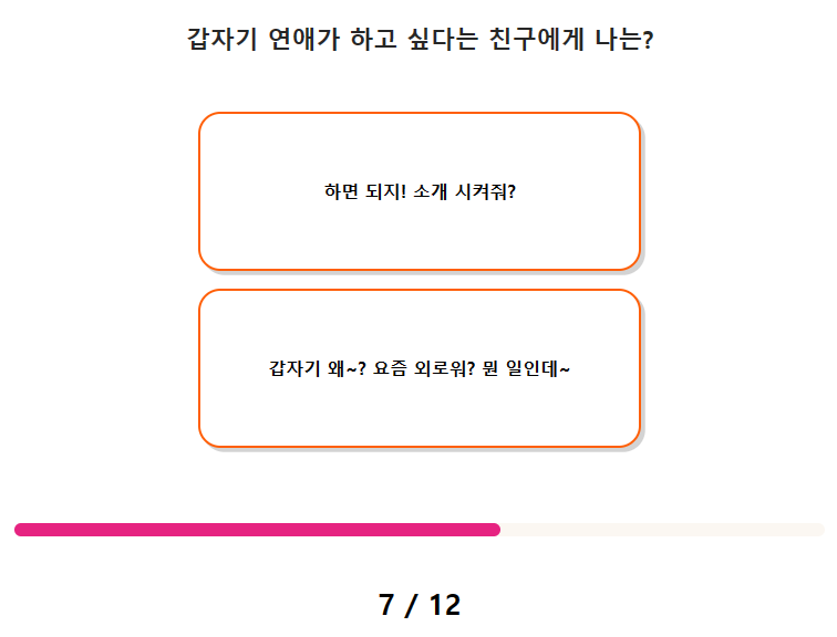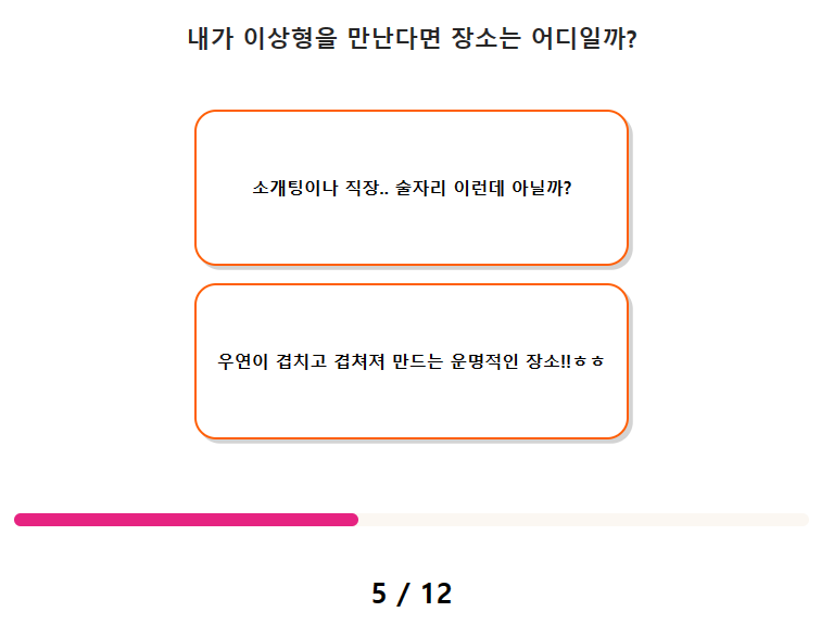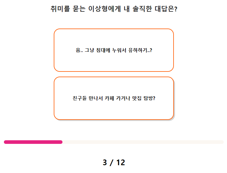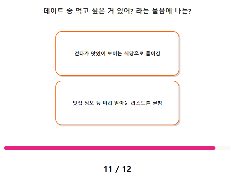 탕후루 이상형 테스트 질문(문항) 수는 총 12가지이며, 테스트 소요 시간은 약 2분 ~ 3분 정도 걸립니다.