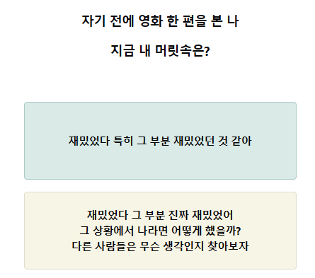2. 자기 전에 영화 한 편을 본 나 지금 내 머릿속은? 1) 재밌었다. 특히 그 부분 재밌었던 것 같아. 2) 재밌었다. 그 부분 진짜 재밌었어 그 상황에서 나라면 어떻게 했을까? 그 상황에서 나라면 어떻게 했을까? 다른 사람들은 무슨 생각인지 찾아보자.