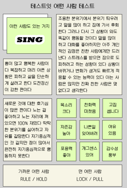 테스트잇 어떤 사람 테스트 결과는 이런 사람도 있는 거지 'SING'이 나왔습니다. Sing의 MBTI는 ESFP입니다.