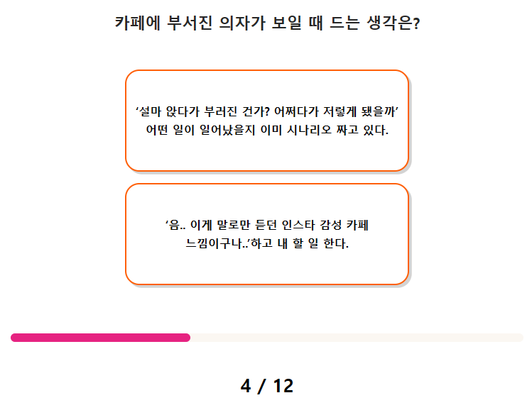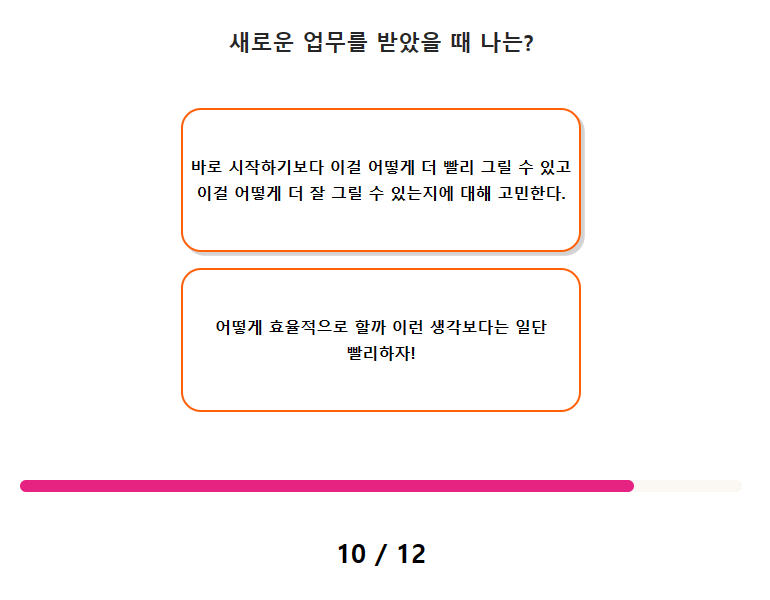테스트 문항에 대한 것들은 평소에 자신이 행동에 맞는 것을 생각하면서 2가지 답변 중 하나 맞는 것을 체크하시면 됩니다.