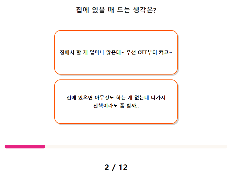 2. 집에 있을 때 드는 생각은? 1) 집에서 할 게 얼마나 많은데~ 우선 OTT부터 켜고~ 2) 집에 있으면 아무것도 하는 게 없는데 나가서 산책이라도 좀 할까..