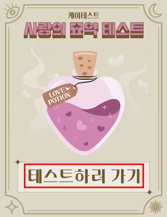 지금부터 케이테스트 사랑의 묘약 테스트에 대한 질문들과 결과를 알아보도록 하며, 테스트를 시작해보도록 하겠습니다.