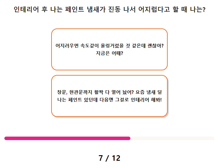 7. 인테리어 후 나는 페인트 냄새가 진동 나서 어지럽다고 할 때 나는? 8. 친구가 공모전 금상 수상했을 때 나는?