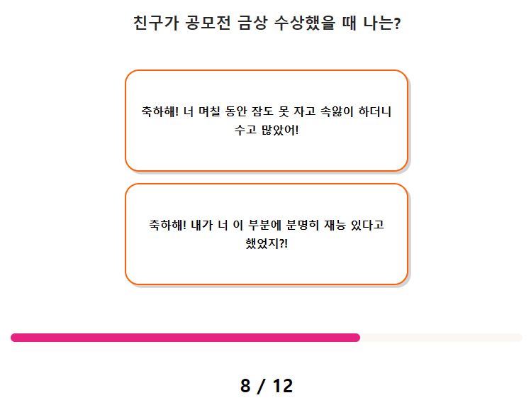 케이테스트 사랑의 묘약 테스트 질문(문항) 수는 총 12가지이며, 테스트 소요 시간은 총 2분 ~ 3분 정도 걸립니다.