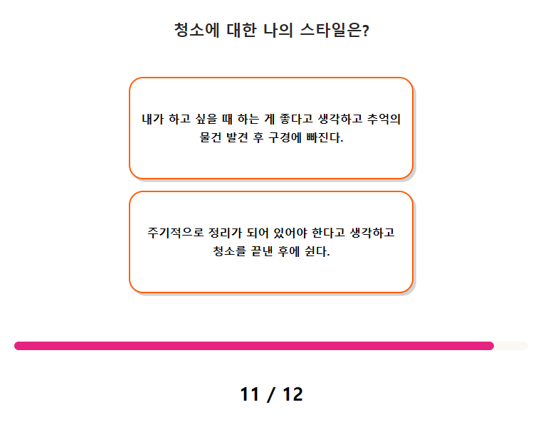 11. 청소에 대한 나의 스타일은? 12. 작업 중 친구가 맛있는 치킨을 포장해 왔다. 이때 나는?