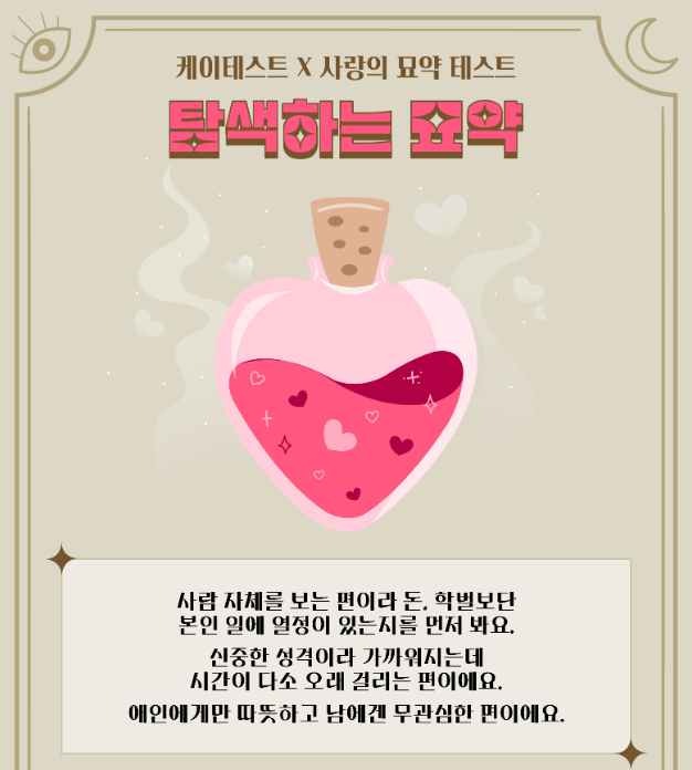 사랑의 묘약 테스트 결과는 '탐색하는 묘약'이 나왔으며, 탐색하는 묘약의 MBTI는 INTJ가 나왔습니다.