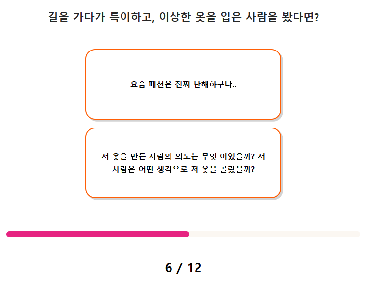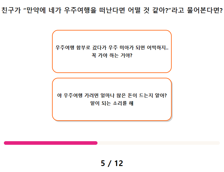 5. 친구가 "만약에 네가 우주여행을 떠난다면 어떨 것 같아?"라고 물어본다면? 6. 길을 가다가 특이하고, 이상한 옷을 입은 사람을 봤다면?