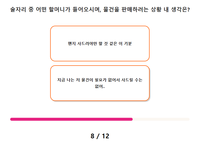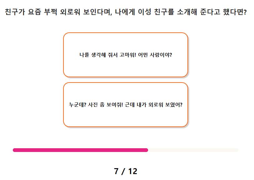 7. 친구가 요즘 부쩍 외로워 보인다며, 나에게 이성 친구를 소개해 준다고 했다면? 8. 술자리 중 어떤 할머니가 들어오시며, 물건을 판매하려는 상황 내 생각은?
