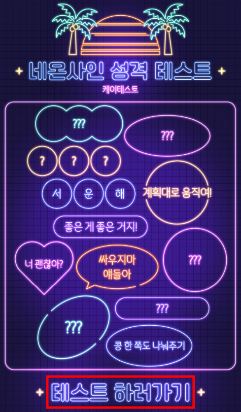 위의 링크를 참고하셔서 '네온사인 성격 테스트' 사이트에 들어가셔서 '테스트 하러가기' 버튼을 클릭하시면 테스트를 시작할 수 있습니다.