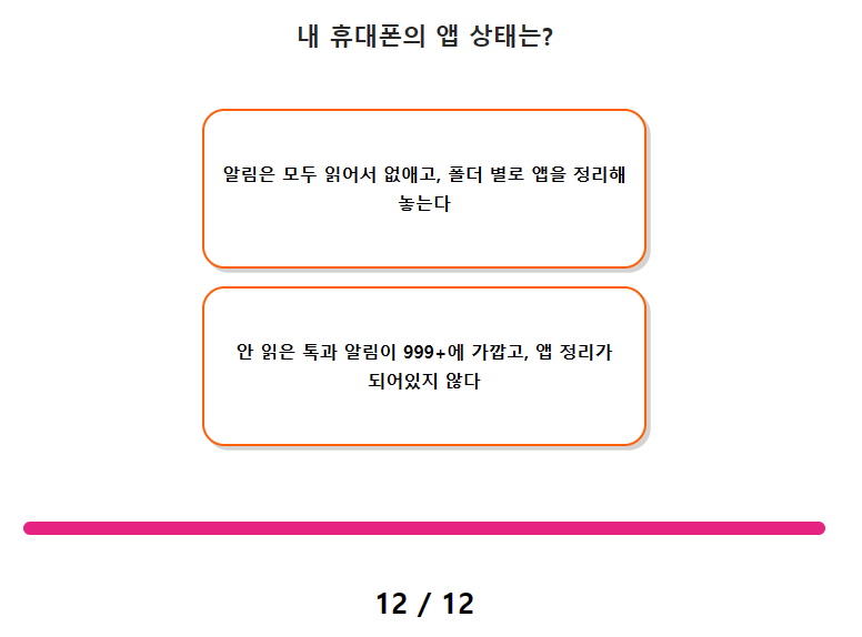 11. 둘 중 나와 비슷한 사람은? 12. 내 휴대폰의 앱 상태는?