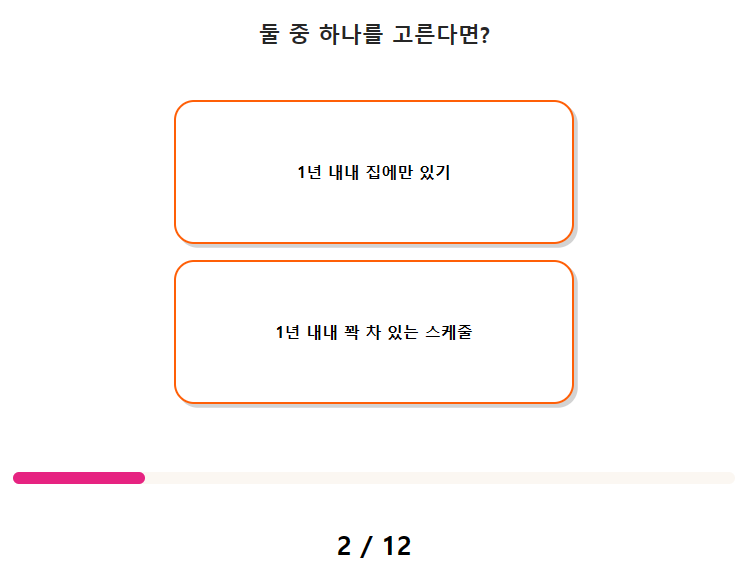 2. 둘 중 하나를 고른다면? 1) 1년 내내 집에만 있기 2) 1년 내내 꽉 차 있는 스케줄