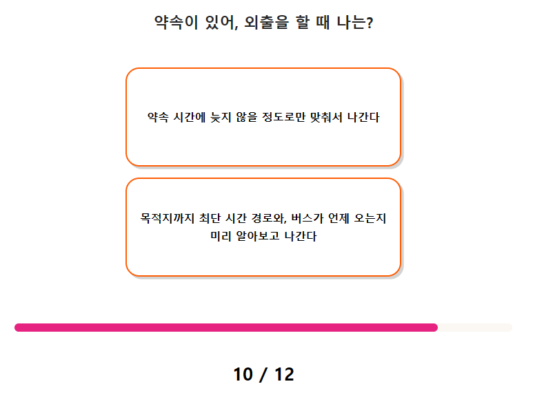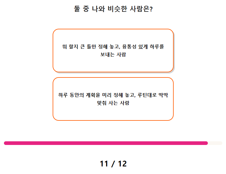 테스트 문항에 대한 내용은 평소에 자신이 행동에 맞는 것을 생각하면서 2가지 답변 중 하나에 맞는 것을 고르시면 됩니다.