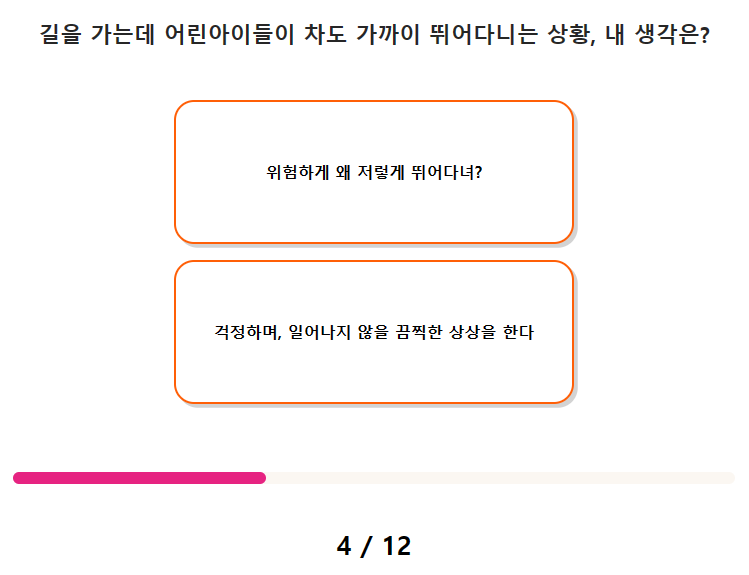 3. 사람이 많은 장소에서 발표를 하게 된다면? 4. 길을 가는데 어린 아이들이 차도 가까이 뛰어다니는 상황, 내 생각은?