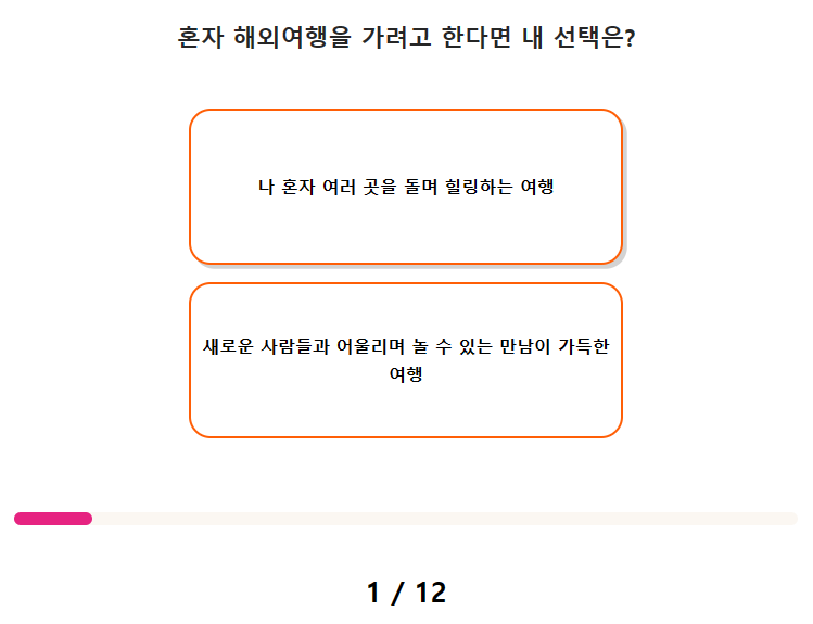 1. 혼자 해외여행을 가려고 한다면 내 선택은? 1) 나 혼자 여러 곳을 돌며 힐링하는 여행 2) 새로운 사람들과 어울리며 놀 수 있는 만남이 가득한 여행