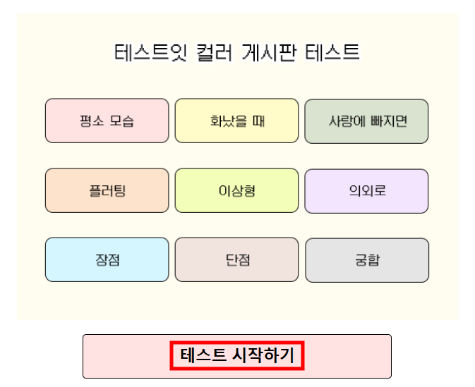 컬러 게시판 테스트를 실시하면서 MBTI 유형별 결과도 함께 알아볼 수 있습니다. 성격 및 심리 테스트를 하는 것을 좋아한다면 아래의 테스트잇 컬러 게시판 테스트를 재미 삼아 해보시길 바랍니다.