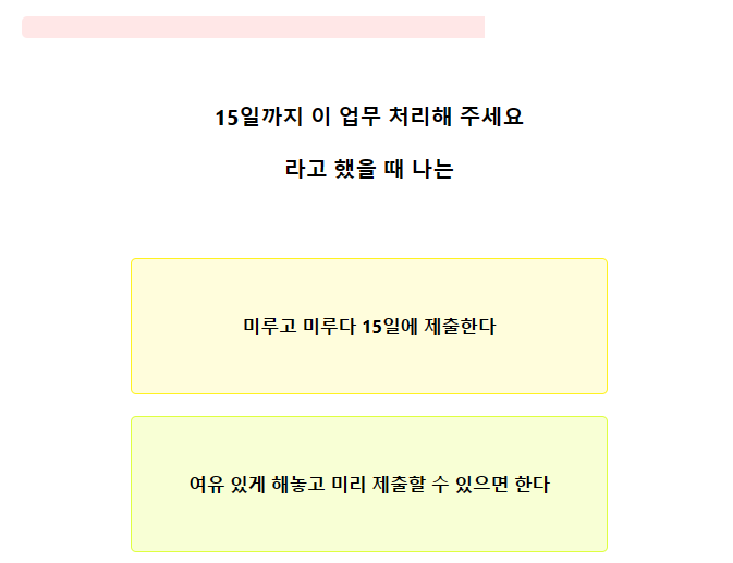 7. 친구가 내가 우울해 보인다며 꽃다발을 사 왔을 때 나의 반응은? 8. 15일까지 이 업무 처리해주세요 라고 했을 때 나는?