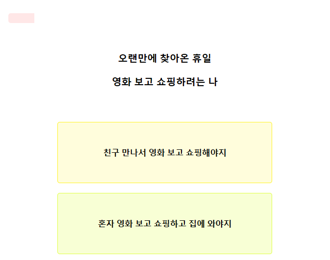 1. 오랜만에 찾아온 휴일 영화 보고 쇼핑하려는 나 1) 친구 만나서 영화 보고 쇼핑해야지 2) 혼자 영화 보고 쇼핑하고 집에 와야지