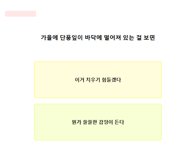 2. 가을에 단풍잎이 바닥에 떨어져 있는 걸 보면? 1) 이거 치우기 힘들겠다. 2) 뭔가 쓸쓸한 감정이 든다.
