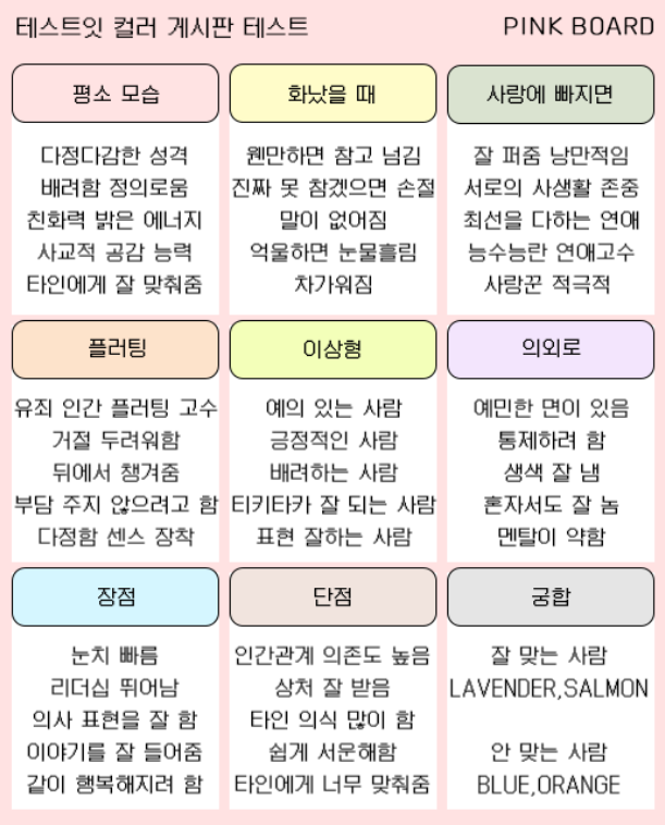 테스트잇 컬러 게시판 테스트 결과는 'PINK BOARD'가 나왔으며, PINK BOARD의 MBTI는 ENFJ입니다.