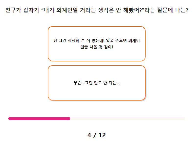 케이테스트 DM(디엠) 성격 테스트 질문(문항) 수는 총 12가지이며, 테스트 소요 시간은 약 2~3분 정도 걸립니다.