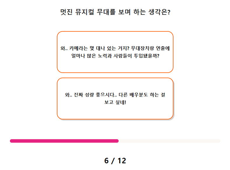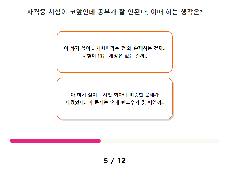 5. 자격증 시험이 코앞인데 공부가 잘 안된다. 이때 하는 생각은? 6. 멋진 뮤지컬 무대를 보며 하는 생각은?