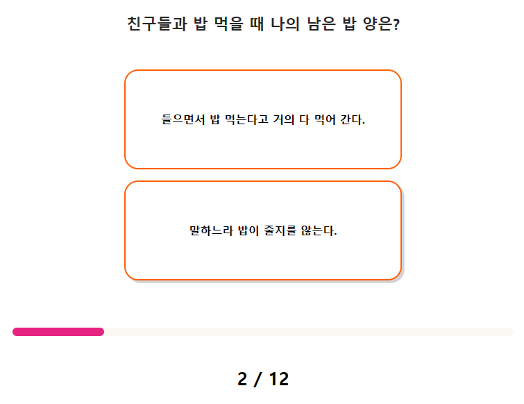 2. 친구들과 밥 먹을 때 나의 남은 밥 양은? 1) 들으면서 밥 먹는다고 거의 다 먹어 간다. 2) 말하느라 밥이 줄지를 않는다.