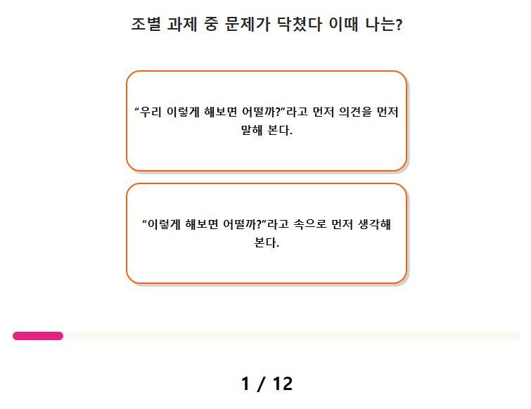 1. 조별 과제 중 문제가 닥쳤다. 이때 나는? 1) 우리 이렇게 해보면 어떨까? 라고 먼저 의견을 먼저 말해 본다. 2) 이렇게 해보면 어떨까 라고 속으로 생각해본다.