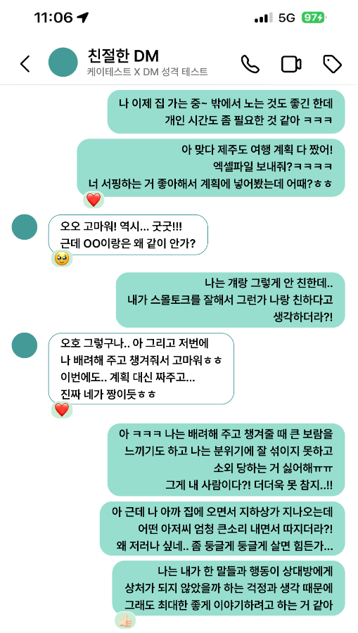 DM(디엠) 테스트 결과 '친절한 DM (ESFJ) '결과가 나왔습니다. 다른 테스트 결과와 달리 메시지를 주고 받는 형식으로 나왔는데요. 디엠(연락)을 주고 받는 내용 안에 자신의 성격이 있으니 읽어보시길 바랍니다.