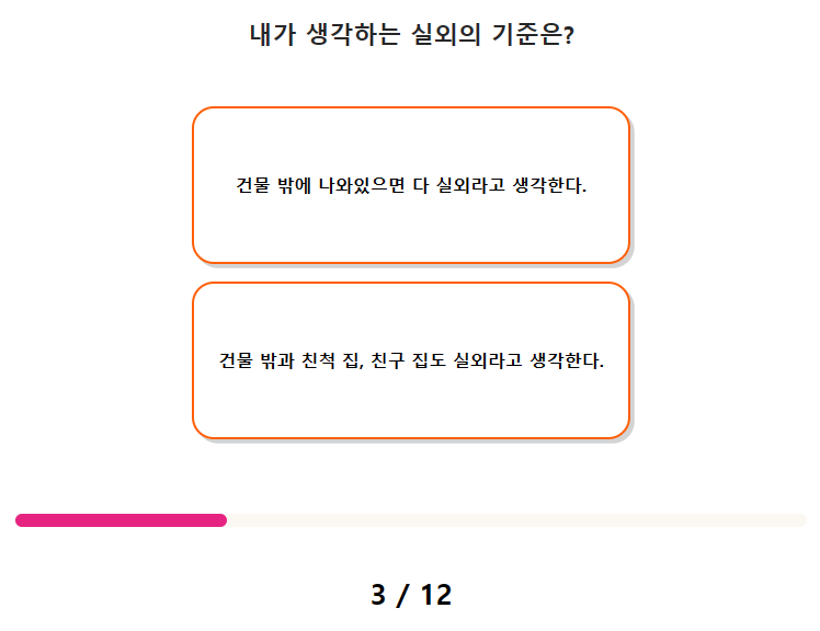 3. 내가 생각하는 실외의 기준은? 4. 친구가 갑자기 "내가 외계인일 거라는 생각은 안 해봤어?"라는 질문에 나는?