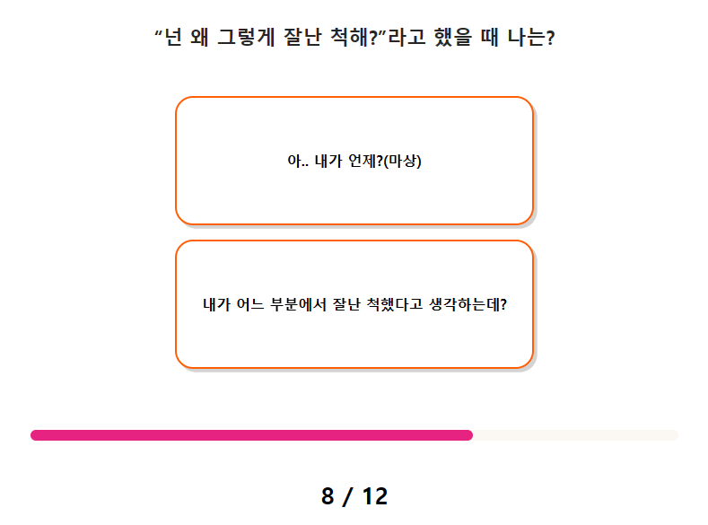 7. 친구가 핸드폰 떨어트려서 액정필름이 나갔다 이때 나는? 8. "넌 왜 그렇게 잘난 척해?"라고 했을 때 나는?