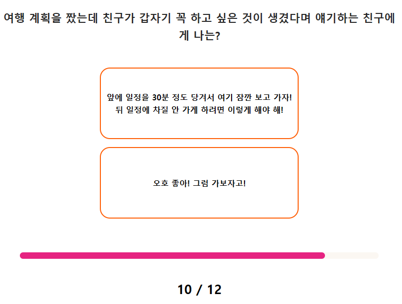 11. 새로운 친목 모임에 가서 사회자가 "2시 30분까지 친해지세요!"라고 했을 때 나는? 12. 한 친구가 여행 계획 브리핑 중에 드는 생각은?