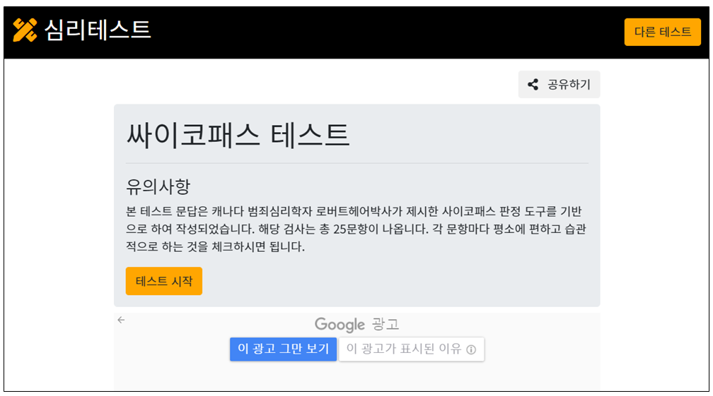 테스트 시작을 클릭하시면 사이코패스 테스트를 실시하실 수 있습니다.