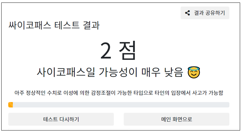 사이코패스 테스트 결과는 2점으로 가능성이 매우 낮음으로 나왔습니다. 저의 생각보다 너무 낮은 점수가 나와서 놀랐습니다. 또 아주 정상적인 수치로 이성에 의한 감정조절이 가능한 타입으로 타인의 입장에서 사고가 가능하다고 나옵니다.