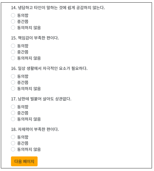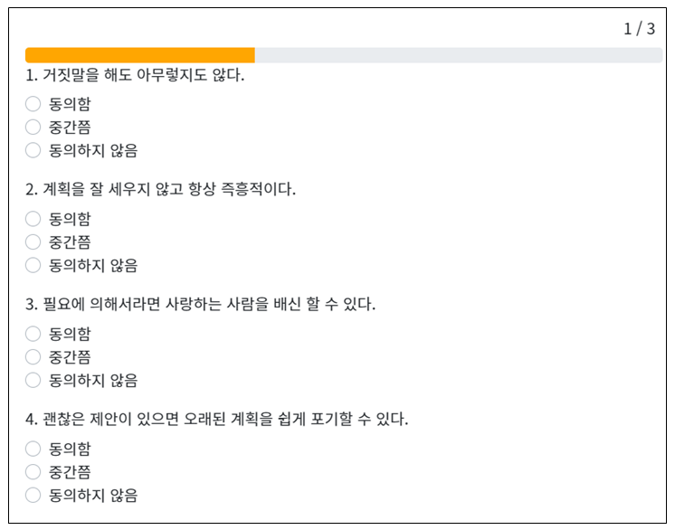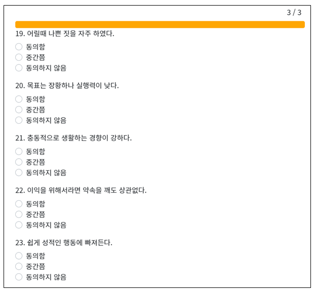 각 문항마다 평소에 편하고 습관적으로 하는 것을 체크하면 됩니다. 테스트 소요시간은 4분~6분 정도 걸리며, 간단하고 쉽게 평가할 수 있습니다. 각 문항마다 동의함, 중간쯤, 동의하지 않음 → 3가지 형태로 나뉩니다. 자신에게 가장 적절한 것을 체크하시면 됩니다.